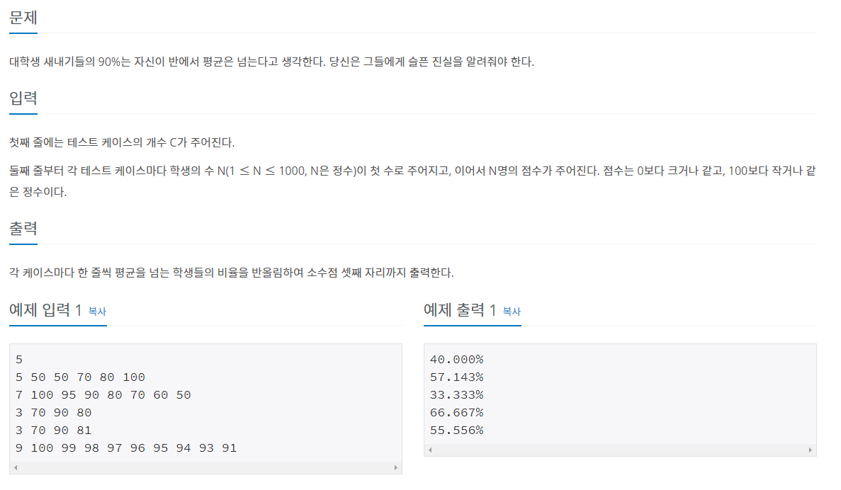 (4344๋ฒ, ํ๊ท ์ ๋๊ฒ ์ง๐ www.acmicpc.net/problem/4344)