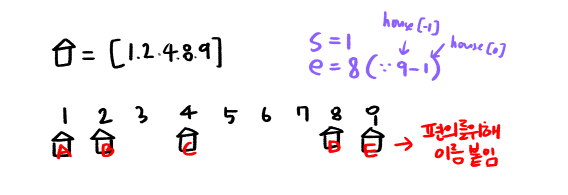 - ๊ทธ๋์ ์ง๊ณผ ์ง ์ฌ์ด์ ๊ฐ๊ฒฉ(dist)๋ฅผ ์ต์(s)์ ์ต๋(e) ์ฌ์ด์์ ์๋ค๊ฐ๋ค ํ๋ฉด์ ์ ๋นํ ๊ฐ์ ์ฐพ๋๊ฒ์ด ๋ชฉํ.