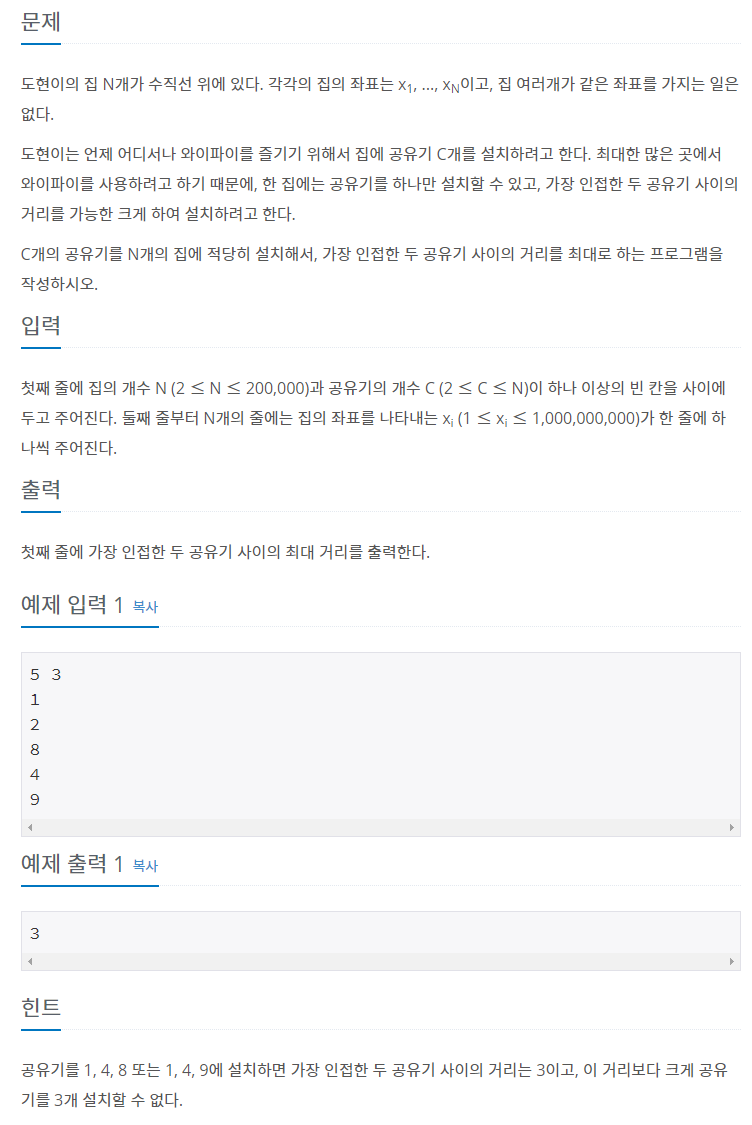 ์ฒซ์งธ ์ค์ ์ง์ ๊ฐ์ N (2 ≤ N ≤ 200,000)๊ณผ ๊ณต์ ๊ธฐ์ ๊ฐ์ C (2 ≤ C ≤ N)์ด ํ๋ ์ด์์ ๋น ์นธ์ ์ฌ์ด์ ๋๊ณ ์ฃผ์ด์ง๋ค. ๋์งธ ์ค๋ถํฐ N๊ฐ์ ์ค์๋ ์ง์ ์ขํ๋ฅผ ๋ํ๋ด๋ xi (1 ≤ xi ≤ 1,000,000,000)๊ฐ
