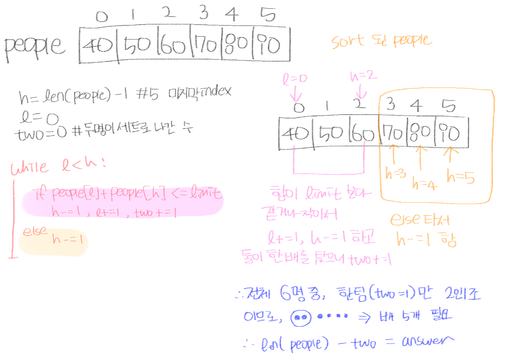 2. ๊ฐ์ฅ ๊ฐ๋ฒผ์ด ์ฌ๋ / ๊ฐ์ฅ ๋ฌด๊ฑฐ์ด ์ฌ๋์ ์ฒดํฌํฉ๋๋ค → light = 0, heavy = len(people)-1
