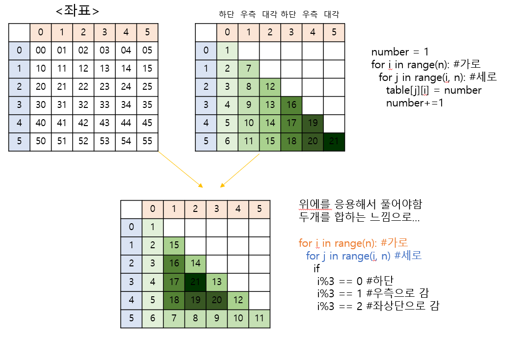 elif i % 3 == 2: #์ผ์ชฝ ์ ๋๊ฐ์ ์ด๋