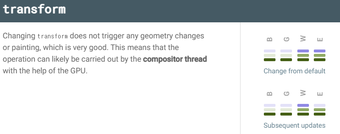 transform์ Composite ๋จ๊ณ๋ง ๊ฑฐ์น๋ฉด ๋๊ธฐ ๋๋ฌธ์ ๋น์ฉ์ด ์ ๊ฒ ๋ค์ด ์ฑ๋ฅ ์ต์ ํ์ ์ ๋ฆฌํ๋ค.