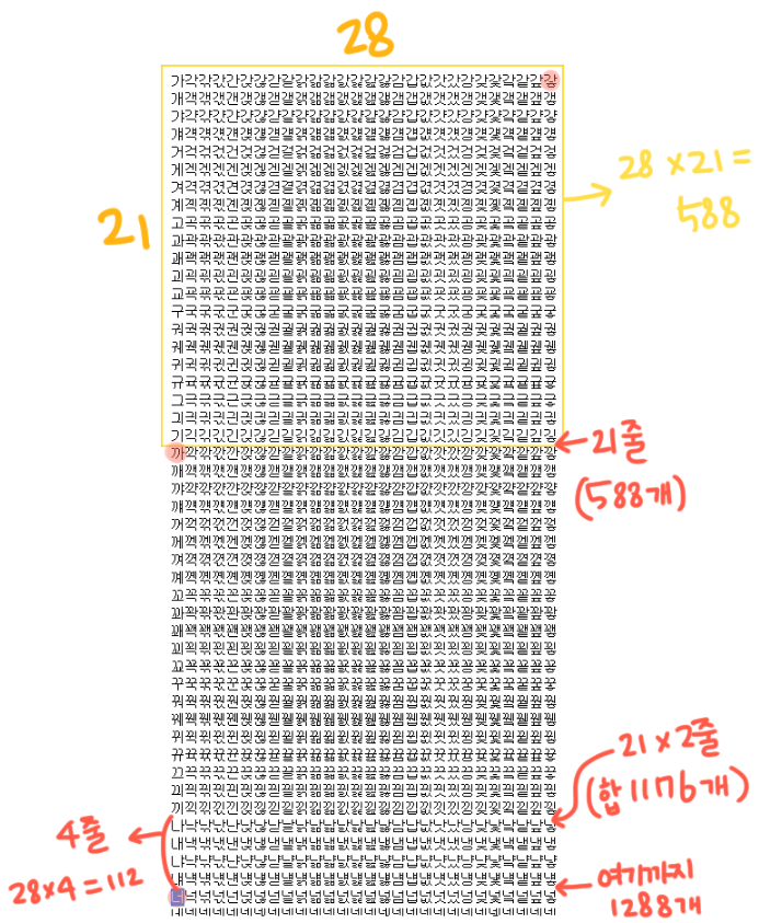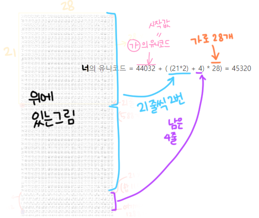 → κΉμ μ λμ½λ = 44032 + (28 * 21) = 44620