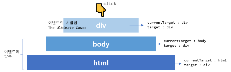 currentTarget: ํ์ฌ ์ด๋ฒคํธ์ ์ฃผ์ธ, ์ง๊ธ ์ด๋ฒคํธ๊ฐ ์ผ์ด๋๊ณ ์๋ ์target: ์ด๋ฒคํธ์ ์๋ฐ(ๅง็ผ)์ , ๋๊ตฌ๋๋ฌธ์ ์ด ์ด๋ฒคํธ๊ฐ ๋ฐ์ํ๊ฒ ๋๊ฑด์ง