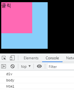 div → body → html ์์ผ๋ก ์ด๋ฒคํธ๊ฐ ์งํ๋๋ ๊ฒ์ ํ์ธํ ์ ์๋ค.