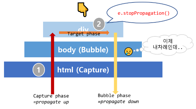 e.stopPropagation(): ๋ถ๋ชจ ํ๊ทธ๋ก์ ์ด๋ฒคํธ ์ ํ๋ฅผ ์ค์ง์ํด (๋ด ๋ค๋ก ๋ค ๋ฉ์ถฐโ!!!)