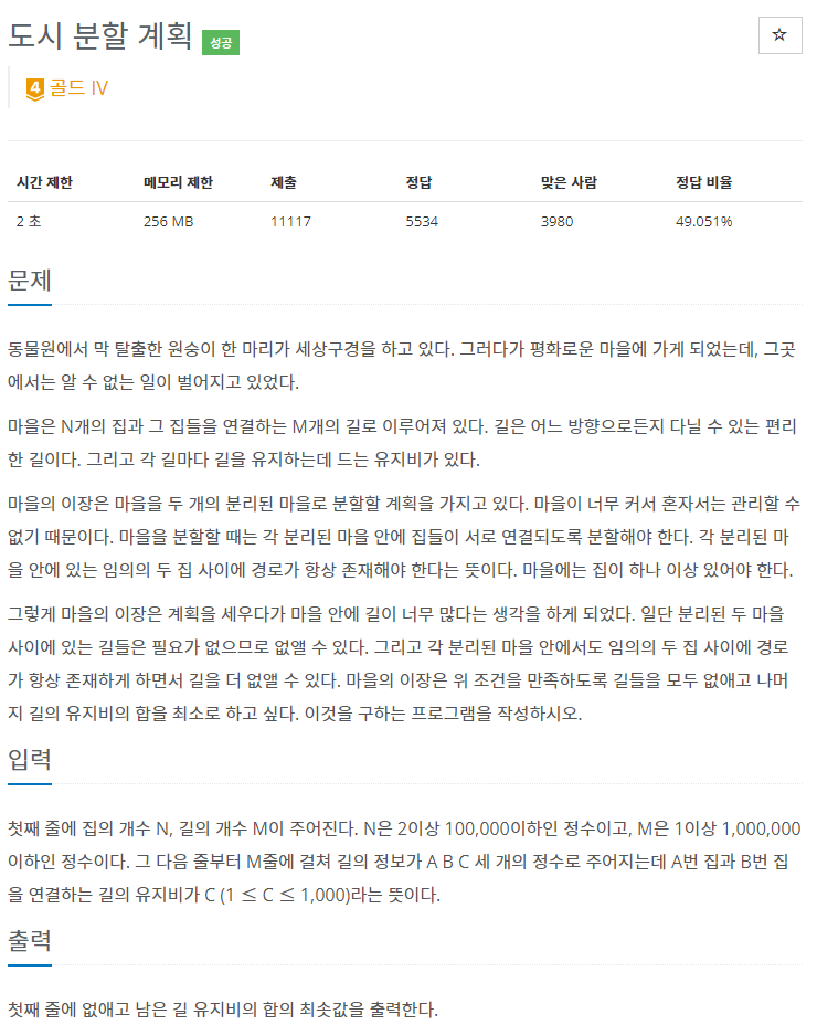 ์ฒซ์งธ ์ค์ ์ง์ ๊ฐ์ N, ๊ธธ์ ๊ฐ์ M์ด ์ฃผ์ด์ง๋ค. N์ 2์ด์ 100,000์ดํ์ธ ์ ์์ด๊ณ , M์ 1์ด์ 1,000,000์ดํ์ธ ์ ์์ด๋ค. ๊ทธ ๋ค์ ์ค๋ถํฐ M์ค์ ๊ฑธ์ณ ๊ธธ์ ์ ๋ณด๊ฐ A B C ์ธ ๊ฐ์ ์ ์๋ก ์ฃผ์ด์ง๋๋ฐ A๋ฒ